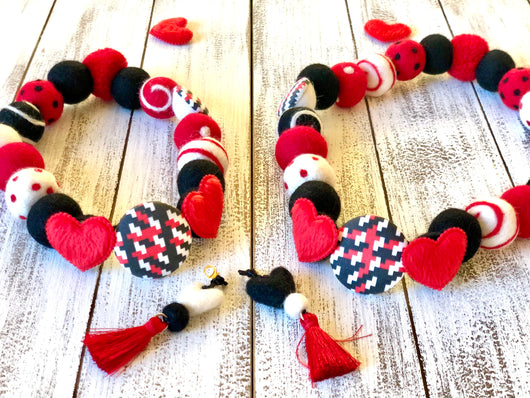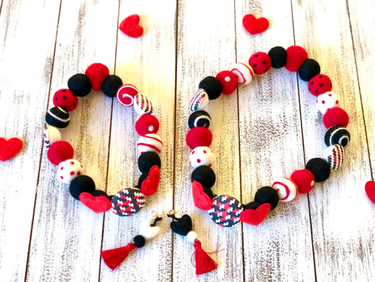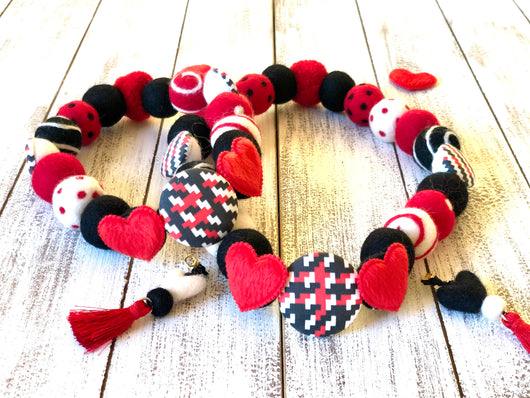 - 2 fuzzy red hearts & Eye catching Valentine's plaid handmade Botans are part of your necklace!
